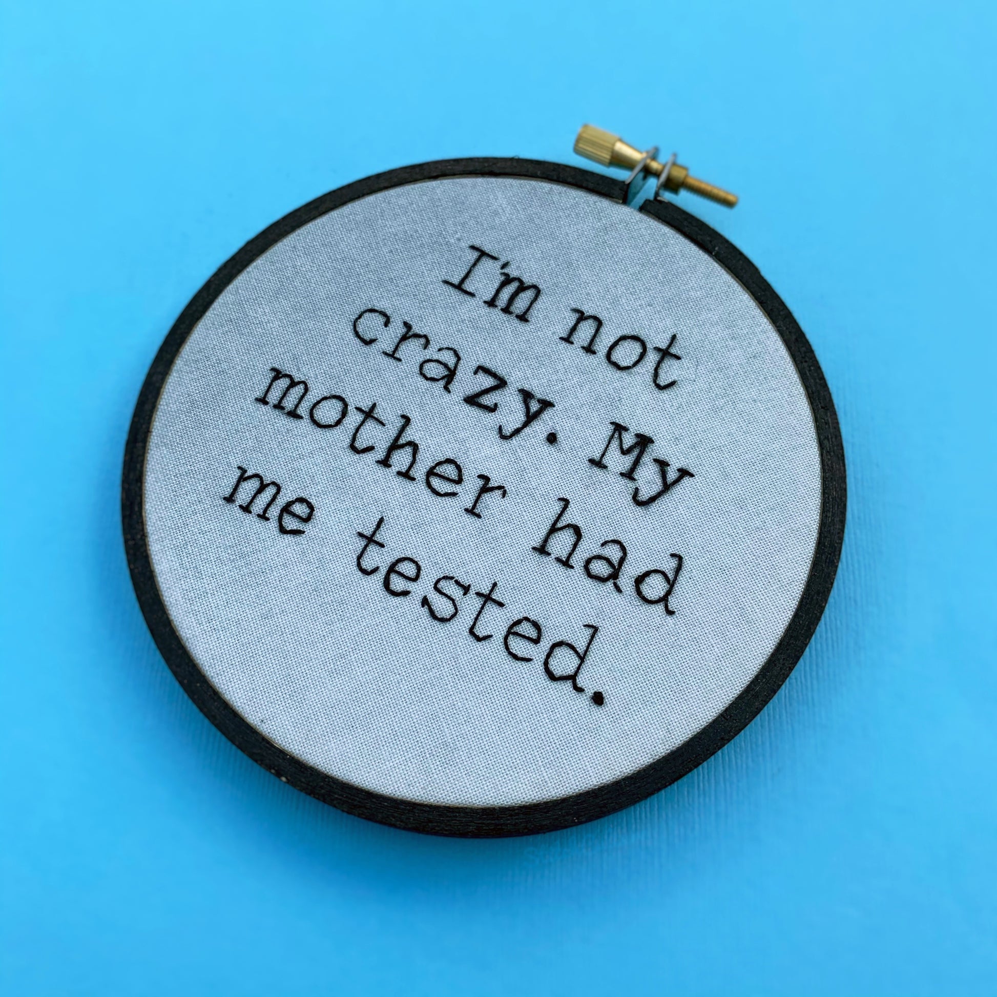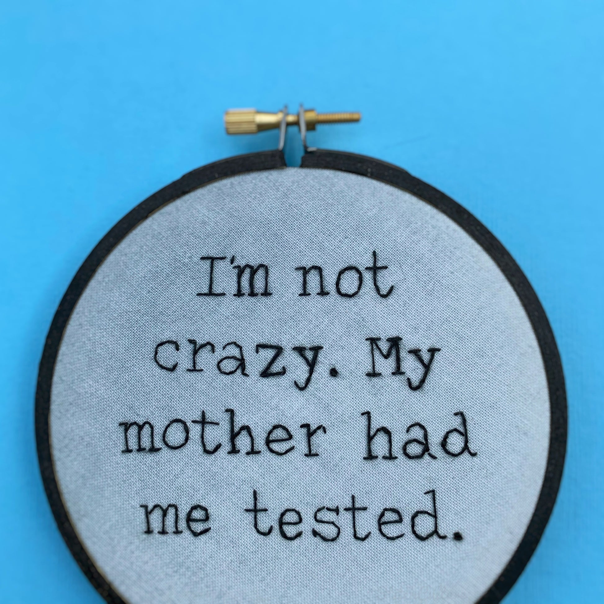 Hand embroidered I'M NOT CRAZY, MY MOTHER HAD ME TESTED hoop