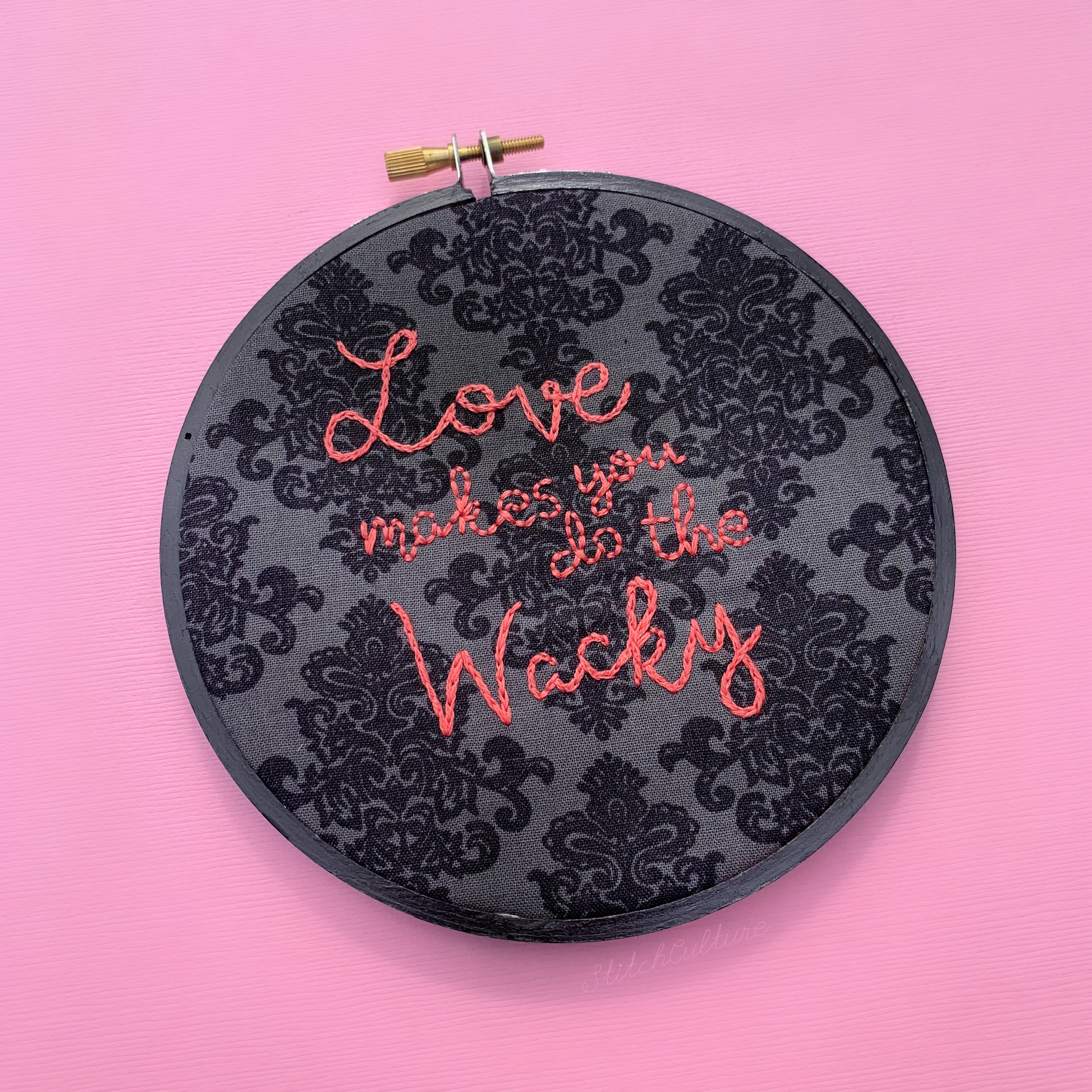Hand embroidered LOVE MAKES YOU DO THE WACKY hoop