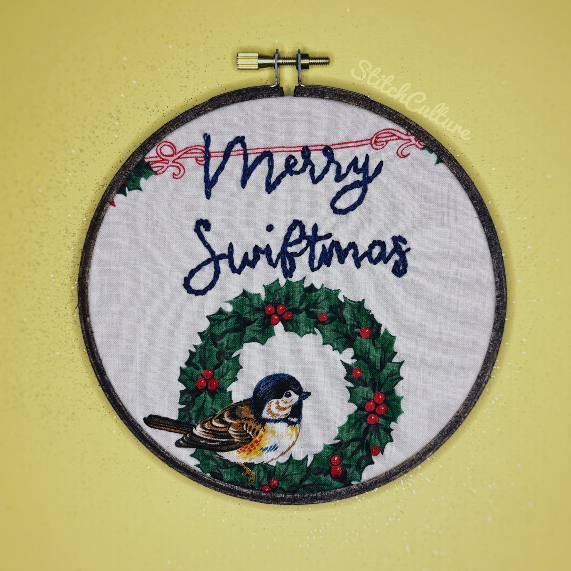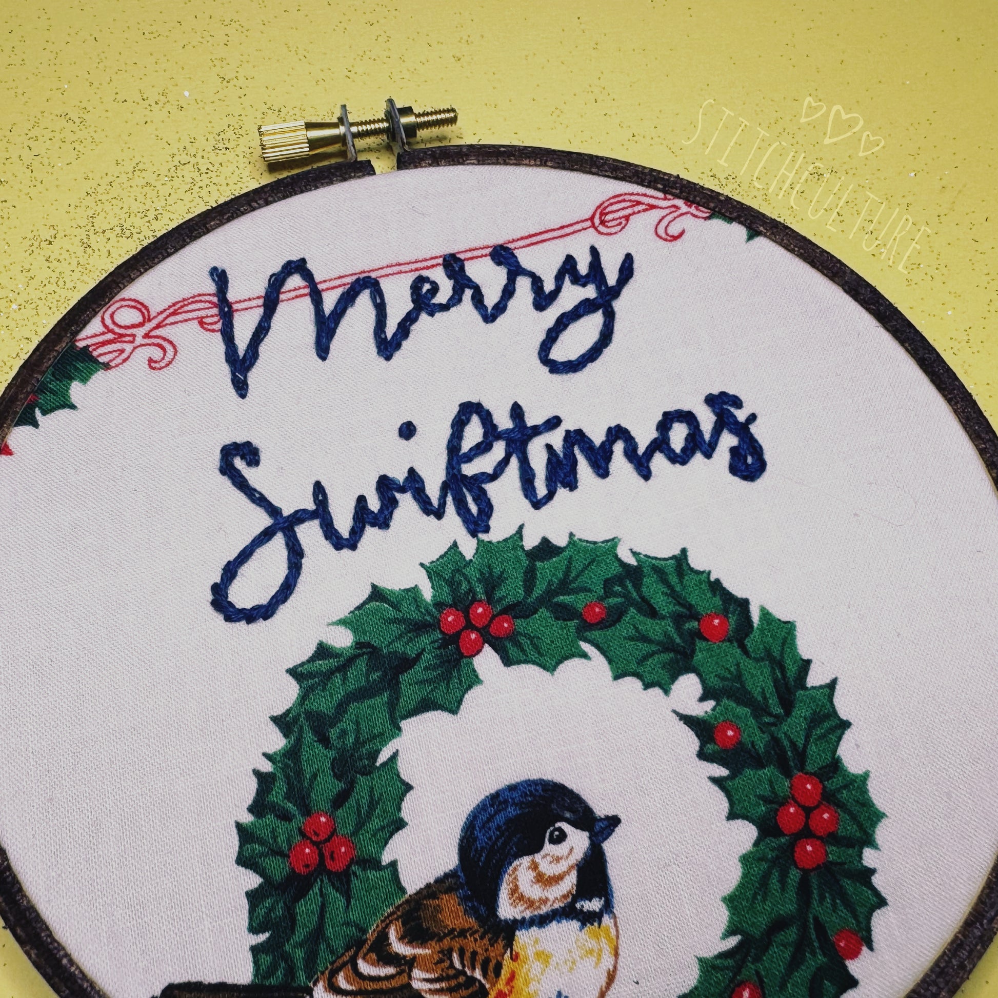 Hand embroidered MERRY SWIFTMAS hoop